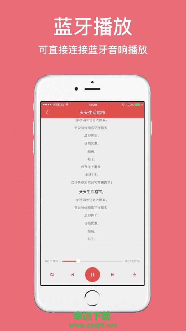 广告叫卖录音app是一款文字转换为语音的配音软件,商场广告促销、地摊叫卖、企业宣传等,制作各类英语配音,广告叫卖录音app适用于商场店铺广告促销配音、英语听力音频制作、地摊叫卖录音制作、有声朗读等多种场景,操作简单,中英文随意切换,多种发音人选择,海量背景音乐,与您的广告完美搭配,同步导出mp3和歌词文件,支持蓝牙音箱播放,无需导出文件,英语听力音频制作等,小说、课本、杂志、童话,打造属于你的个性化听书app,学校、车站、机场、企业、商场的广播播音,动画片、flash影片、各类广播剧,防盗、报警、车辆船舶导航系统的语音录制,有声读物、课件、文艺作品、培训软件的语音录制,需要的小伙伴快来幸运软件园下载使用吧。