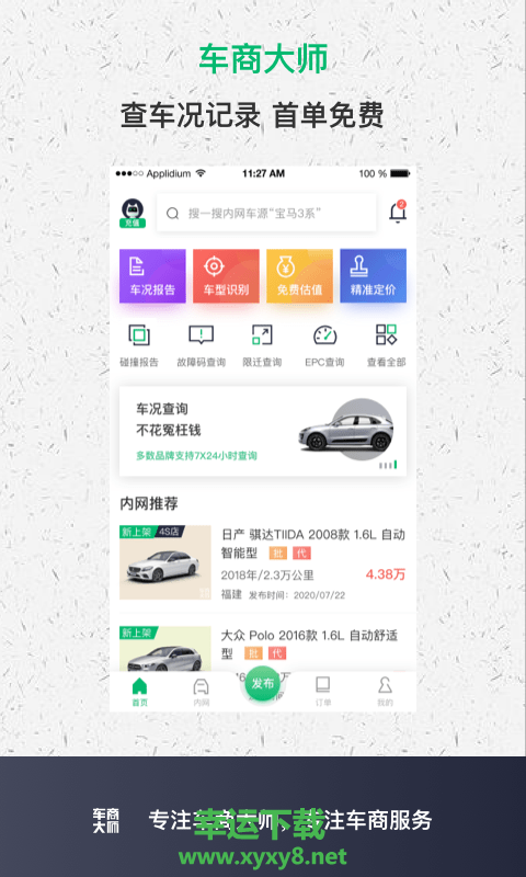 车商大师app是一款非常好用的网络购车类软件,以及它的历史信息,他们将通过您留下的电话号码与您取得联系您可以通过车商大师复制车源,快速发布大量车源信息十万车商的共同选择让二手车交易变得更公平、透明、便捷当要进行二手车交易的时候可以在此查询该车辆的历史车况,不想手动输入的话可以使用扫一扫的功能,只要扫描VIN码的话照样可以查询车况;查询任何一辆车都能得到详细的查询报告,可以从报告之中掌握该车的所有车况信息;能够为用户提供二手车交易的价格参考,这样在交易的时候才能做到心里有数;支持全天查询,不管什么时候有需要都能随时随地的在此查询二手车信息;一览查询报告,打开报告的话可以知道汽车的违章、保险、维修记录等信息;掌握汽车配置,在此可以清楚了解这个汽车的车身部件、很重要部件和外观情况;方便用户购置二手车。用户能用它查看车辆的详细信息,从而降低二手车交易风险,帮助用户远离欺骗。需要的小伙伴快来幸运软件园下载使用吧。
