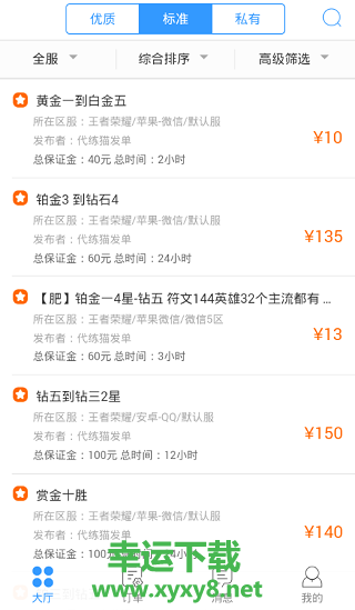 3.第一步:您可以通过本页面下载代练猫app,注册后进入到大厅,您可以看到这里有优质、标准、私有单,但目前只能打开标准的,小编亲测的是第一个单,打开它。