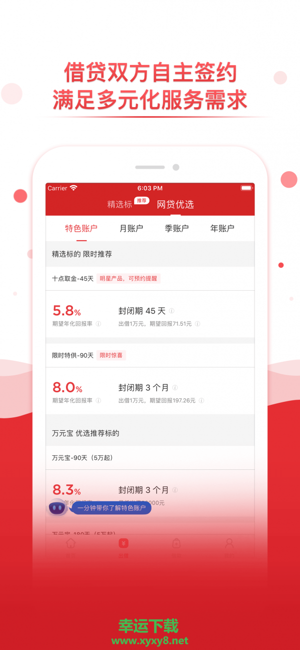 玖富普惠app是一款值得信赖的互联网理财平台,优选服务 工薪门槛,支持发布出借贷款信息,通过互联网发布到平台。专业风控团队,玖富普惠app运用多重安全风控系统,真实实现点对点出借,为贷款人推荐最合适的出借方案,节省大量时间。完成的订单自动保存,随时随地都能进入搜索查询。我们始终将客户的财富管理需求与富勤管理增值作为首要目标,玖富普惠 信用随行,为您的信息与资金保驾护航!能够全方面保障借贷双方资金财产安全。 “保障计划专款”专用账户。优选计划,精选标的,太平洋财险账户资金安全险,火眼征信,彩虹评级,多方位举措风险监测,网贷平台,业界榜样,平台只做到担保以及撮合服务,不提供任何贷款产品。资金由第三方托管,粉丝文化,创新式体验,多方位深度互动,出借门槛低至100元,需要的小伙伴快来幸运软件园下载使用吧。