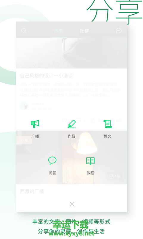 6.发现:艺术,设计,手工,diy教程…无论你的爱好是什么?都可以寻找到你所感兴趣的社群,与大家一起分享交流DIY手工制作的经验,更可以与设计师们一起探讨生活美学。