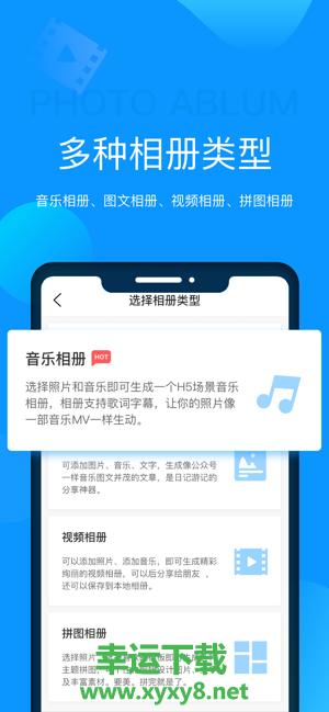 3、一键式应用程序,分三步轻松创建精美的音乐专辑,视频专辑,电子专辑,短视频,朋友圈视频,微信专辑,企业宣传专辑,贺卡,邀请函等;