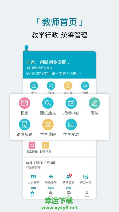学程app是一款互联网式教育服务软件,帮助学校构建一套模型指标,监督学生不参与消极的事情,构建学生积极的价值观和培养学生成长成才的能力。运用互联网手段,提供一组工具,解决教育过程中的一系列痛点,关键消息,随时触达;素质能力,全面掌握。可有效在线统一管理自己的班级,不用在学校就能详细了解学生情况。所有的行为都能轻松记录,更便于用户可以随时随地在线查看。我们依据高效专业人才培养方式,在应用中就能实现投票,告别传统的纸质投票方式,更简单;含有信息提醒功能,系统信息、通知信息及时提醒,以便及时发现;请假审批在线即可完成,不用面见学校老师领导,请假更简便;支持用户在线查看自己的成绩,不用到学校,就能详细了解;可有效在线统一管理自己的班级,不用在学校就能详细了解学生情况,需要的小伙伴快来幸运软件园下载使用吧。