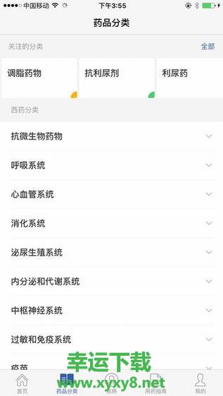 6、辅助搜索:可通过适应症、药理分类等多种方式查询,并可随时收藏个人常用药;