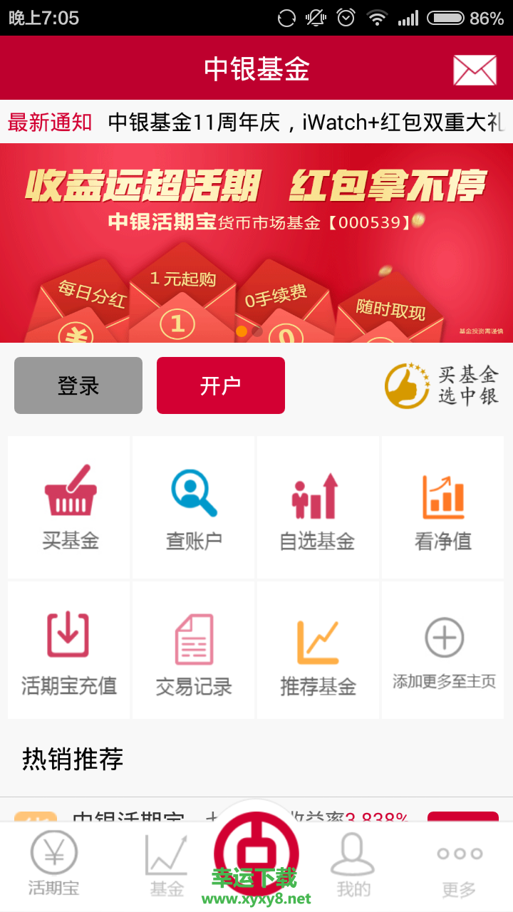 中银基金app是一款专业的理财应用,投资有风险,入市须谨慎!这款软件可以为各位用户提供基金开户、交易,账户查询等等功能,还有专业的客服为用户提供一对一的服务!中国银行子公司中银基金管理有限公司官方App。除此之外,还提供活期宝快速取现功能,每日T+0快速取现额度1万元。中银基金官方App,您的贴身理财好帮手。专为用户提供丰富的基金理财产品,这款应用集合了基金开户、基金交易以及账户查询等功能,无需到线下银行办理,线上可以一键开户,没有基金账户的人可以快速的开户;随时查看自己的账户资金余额,根据实际情况购买基金;可以查看基金产品带来的净值数据,能够掌握变化的趋势;线上可以随时充值购买基金的资金,也能随时提现其中的资金;中银活期宝,自己账户中的资金可以任意使用;交易记录,实时记录了你的每一次购买基金的详情;基金产品关注,可以批量关注感兴趣的基金理财产品;数据分析,能够帮你分析每种产品的行情数据,需要的小伙伴快来幸运软件园下载使用吧。